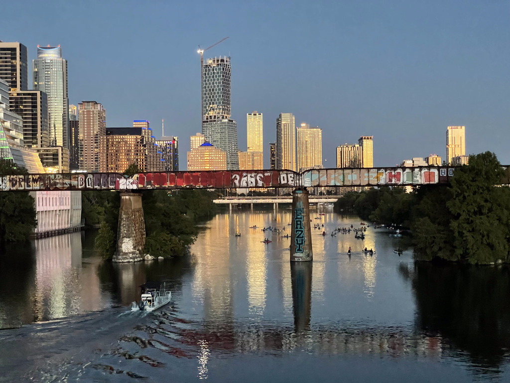 2025-09-26 Friday 7:42pm CDT at 30.2654306,-97.7558361 (osm) (gmap) (nearby pictures) near Pfluger Pedestrian Bridge, Ann & Roy Butler Hike and Bike Trail, Seaholm, Austin, Travis County, Texas, 78701 |